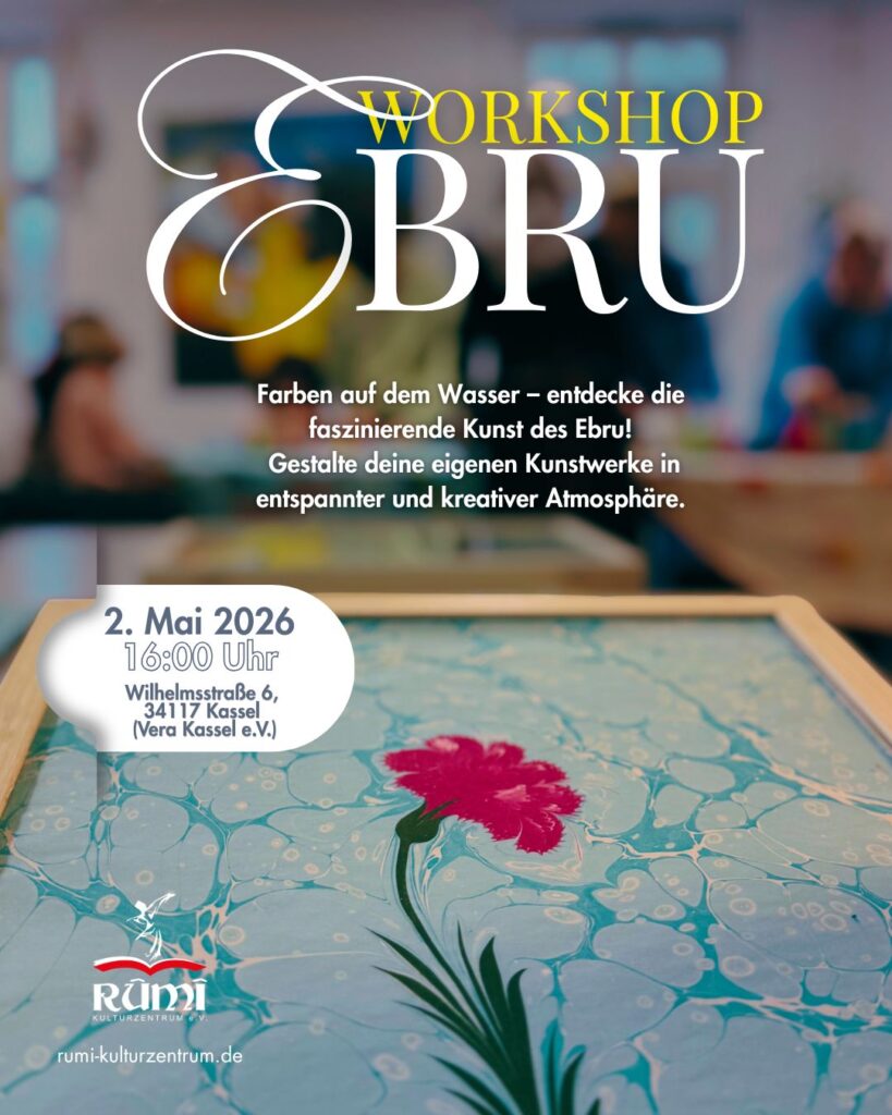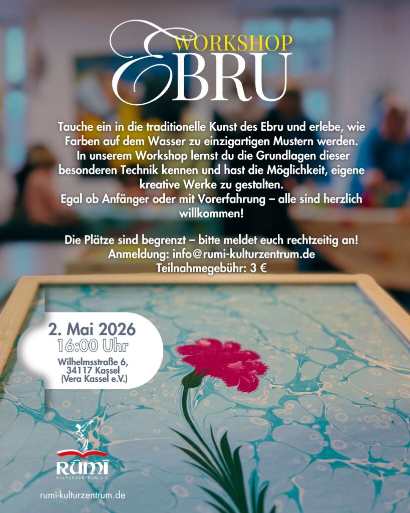 In unserem Ebru-Workshop laden wir Sie ein, diese besondere Kunstform selbst zu erleben. Sie erhalten eine Einführung in die Grundlagen und können anschließend eigene kreative Arbeiten gestalten. Dabei steht neben der Technik vor allem die Freude am gemeinsamen, kreativen Arbeiten im Mittelpunkt.