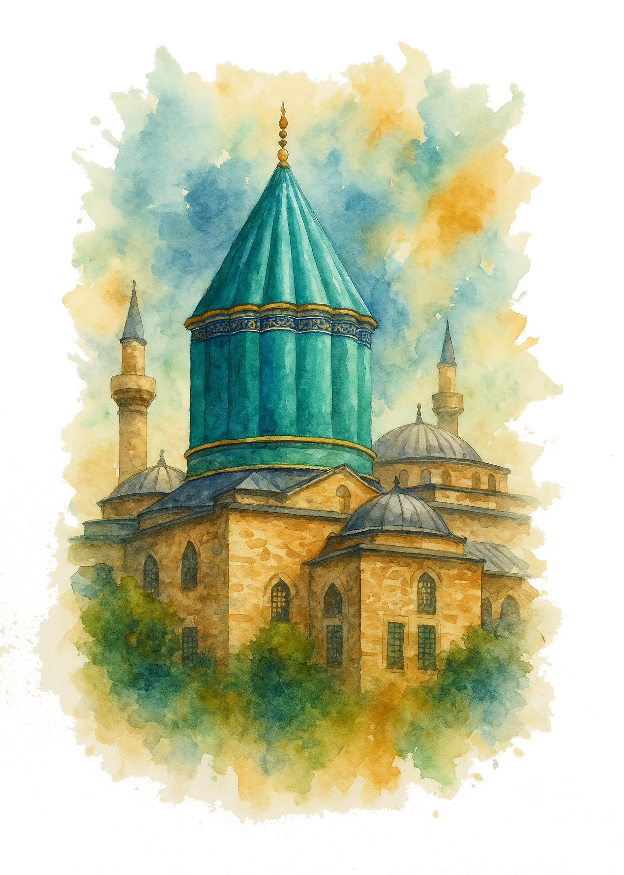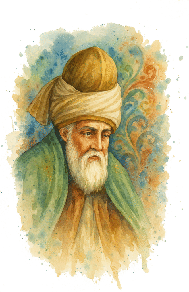 Mevlana Celaleddin-i Rumi (1207–1273) wurde in Balkh (im heutigen Afghanistan) geboren und verbrachte den Großteil seines Lebens in Konya (Türkei), Anatolien. Er war ein bedeutender Gelehrter, Mystiker, Dichter und Philosoph des Sufismus. Rumis Werke und Gedanken haben über Jahrhunderte hinweg Menschen aus verschiedenen Kulturen, Religionen und Sprachen inspiriert – bis heute.