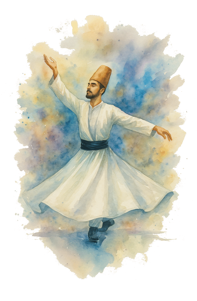 Der Semazen ist ein Derwisch der Mevlevi-Orden, der den berühmten „Sema“-Tanz ausführt – eine spirituelle Zeremonie, die auf die Lehren von Mevlana Celaleddin-i Rumi zurückgeht. Der Sema ist kein gewöhnlicher Tanz, sondern eine Form des Gebets und der Meditation in Bewegung.
