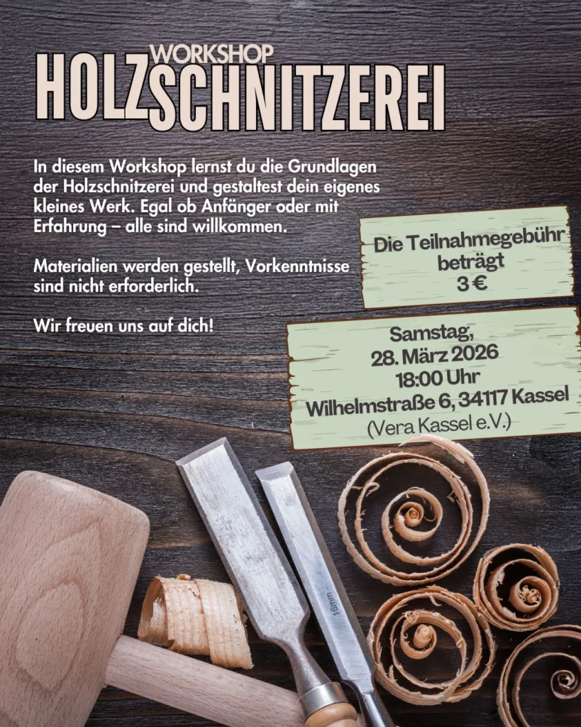 Unter der Leitung von Mahmut Bülbül laden wir euch herzlich zu unserem Holzschnitzerei-Workshop ein. Gemeinsam verbinden wir Natur, Kunst und Handwerk und entdecken dabei unsere eigenen kreativen Fähigkeiten.
