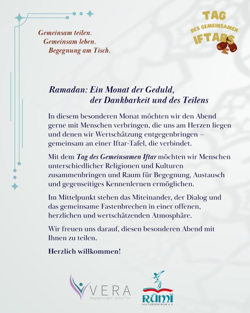 Im Mittelpunkt stehen das Miteinander, der Dialog und das gemeinsame Fastenbrechen in einer offenen, herzlichen und wertschätzenden Atmosphäre.