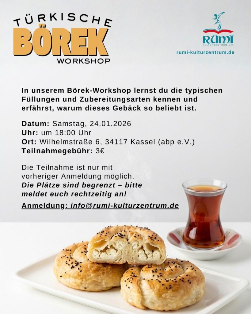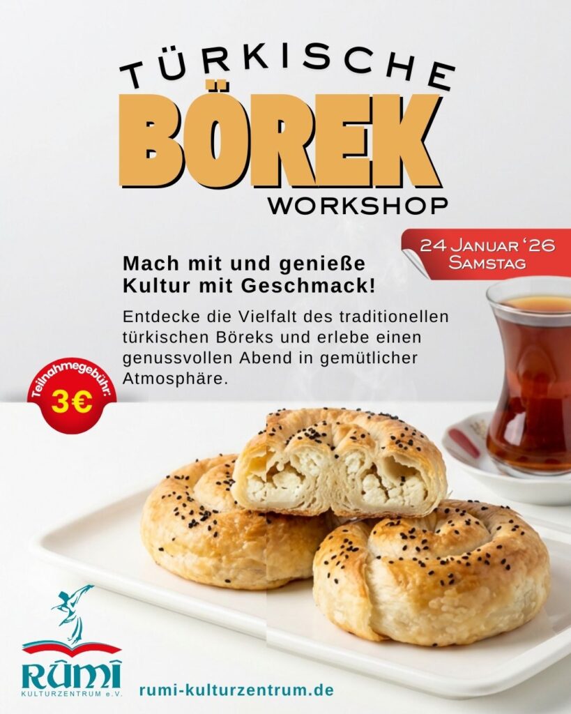 Unter Anleitung unserer erfahrenen Mitglieder lernt ihr verschiedene Füllungen kennen – von Spinat bis Käse – und könnt natürlich selbst mitbacken. Zum Abschluss genießen wir die frisch gebackenen Böreks bei einer Tasse Tee und netten Gesprächen.